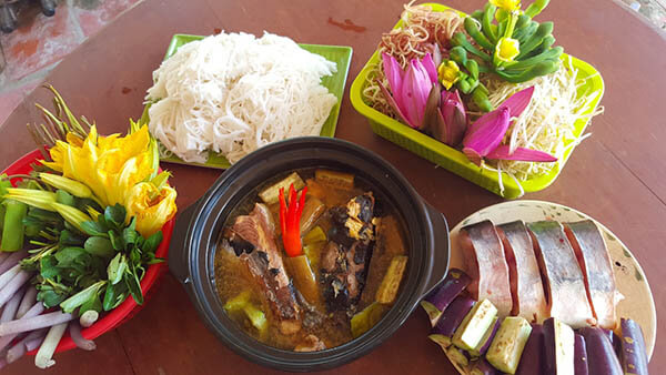 The lunch buffet features a wide range of southern Vietnamese dishes such as cá lóc nướng trui, snakehead fish grilled in burning straw, bún mắm, or Khmer thick fermented vermicelli, and southern-styled bánh xèo, also known as Vietnamese pancake. Visitors can find themselves immersed in the lifestyle in the Mekong Delta at Tân Lập Floating Village.