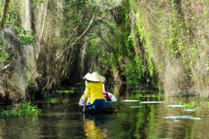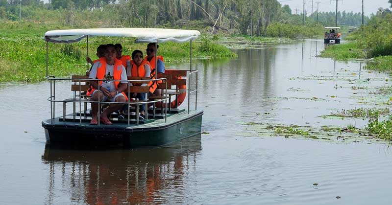 The best way to explore the floating village and melaleuca forest is on a rowing boat, the boatman will always be your guide, bring you to crept to discover and learn about the giant swamp, green vegetation or watching the blooming lotus pond. The boat ride through the Melaleuca Forest takes about 30 minutes and would be funny and lovely scenery along with the white tree stumps and leafy foliage covering the area.